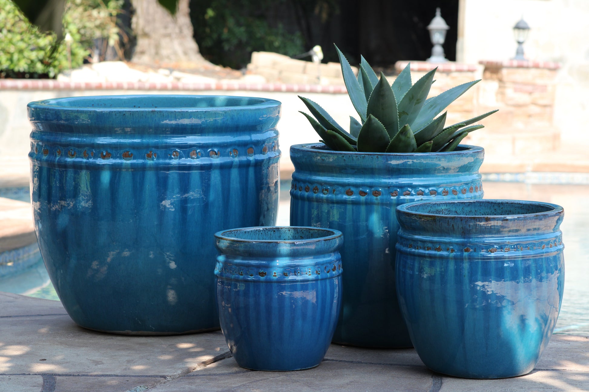 Featuring intricate rim detailing and beautifully glazed, this ornamental outdoor planter set has every size perfect for potting flowering plants, vegetables, or succulents allowing you to care for your beloved plants while adding flair to your outdoor sanctuary.